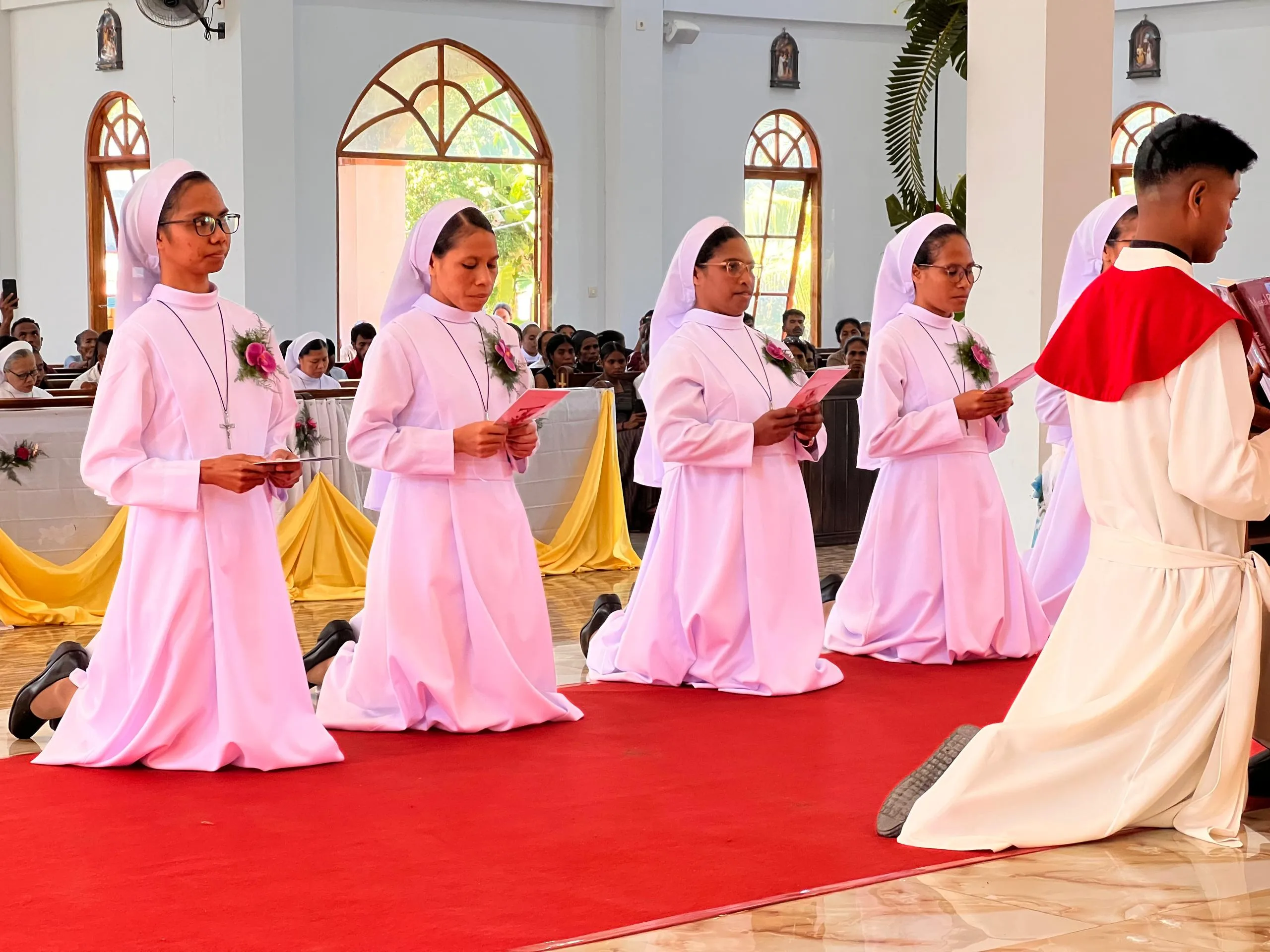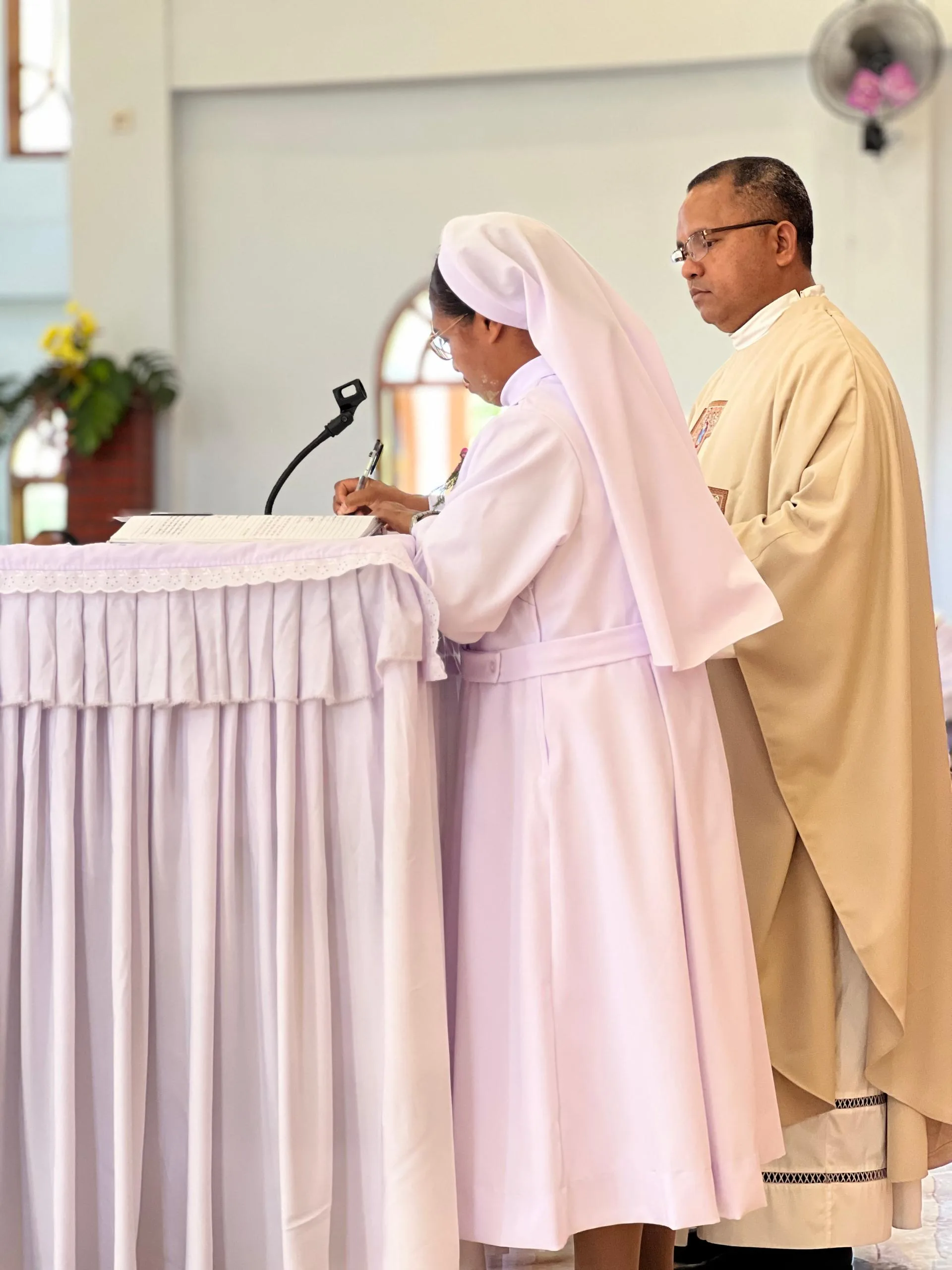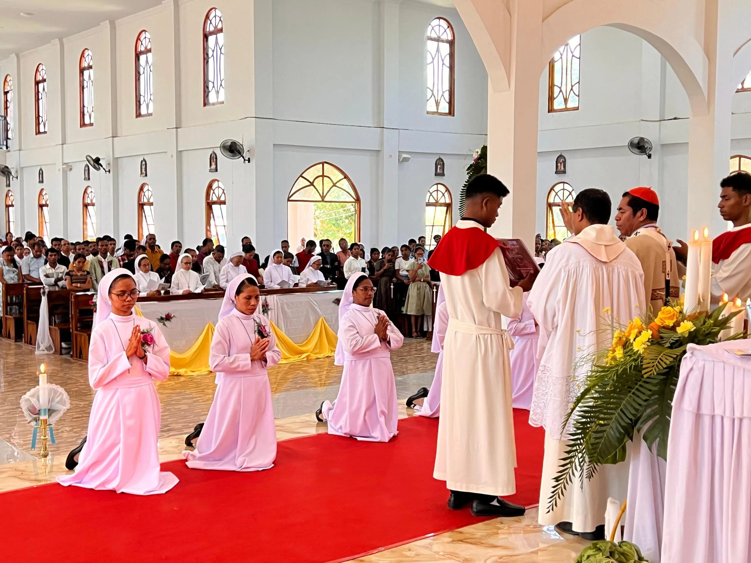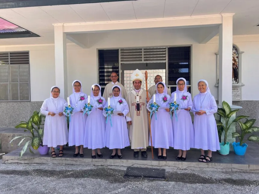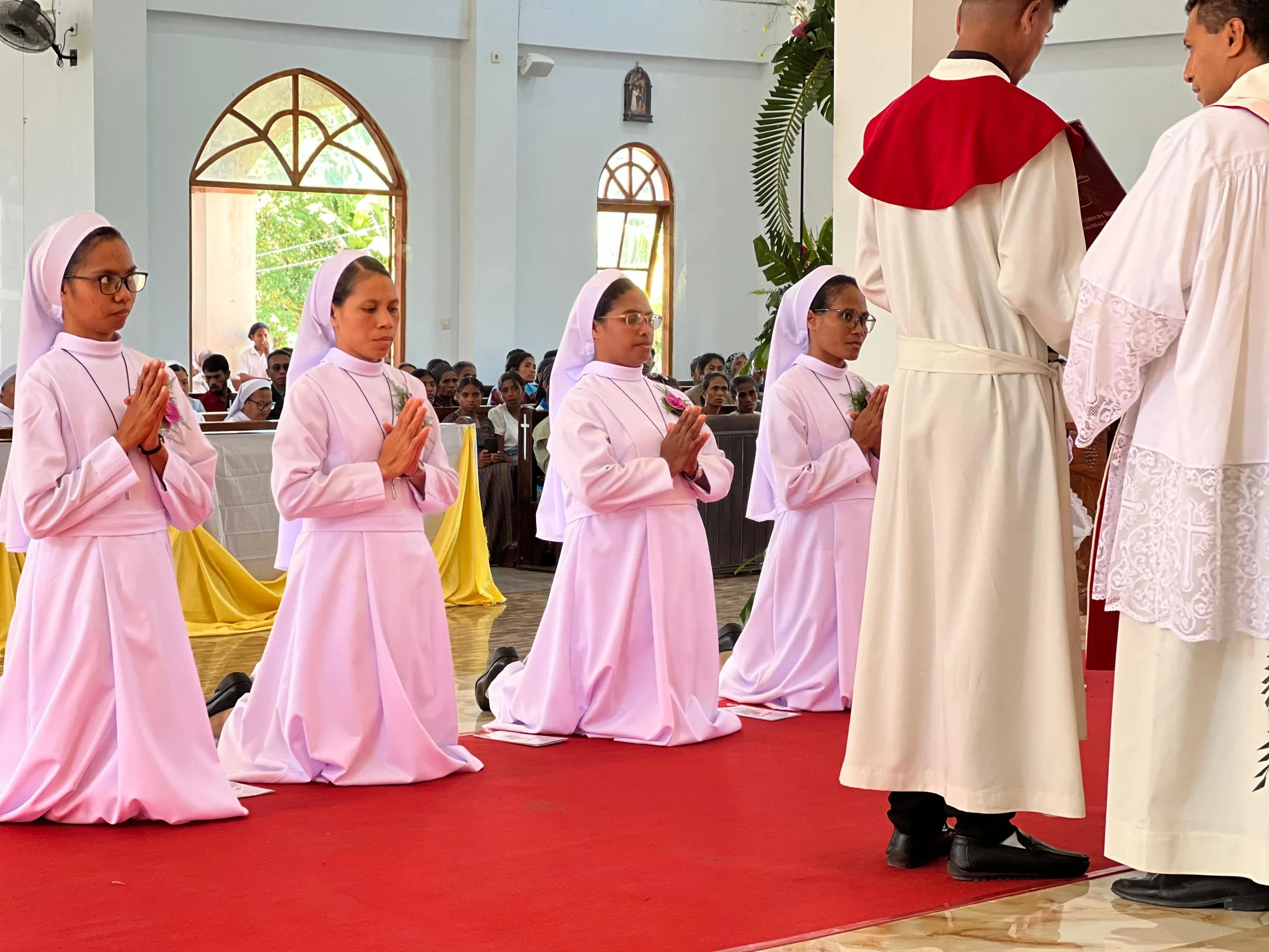 Lima suster FSGM Timor Leste mengikarkan kaul kekal di Gereja St. Fransisco de Asisi Fatuberlio, Wekiar Timor Leste, Senin, 11 Agustus 2025.