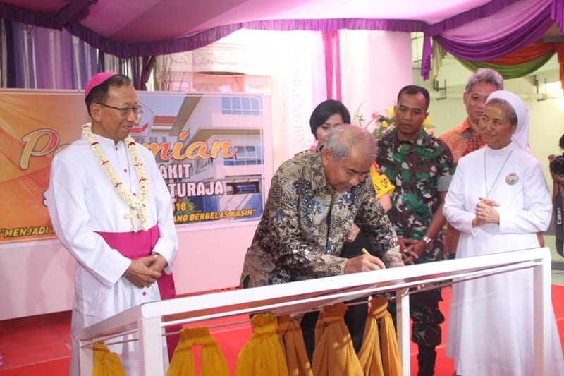 Kedatangan Bupati dan rombongan disambut oleh drumband dari SD Fransiskus Baturaja. Acara peresmian RS Antonio yang baru, ditandai dengan pemukulan gong dan penandatangan prasasti oleh Bupati Kuryana Azis dan Uskup Agung Palembang Mgr. Al. Sudarso SCJ. Selain itu, pelepasan tujuh ekor burung merpati dan pengguntingan pita. Dilanjutkan dengan peninjauan lokasi gedung.